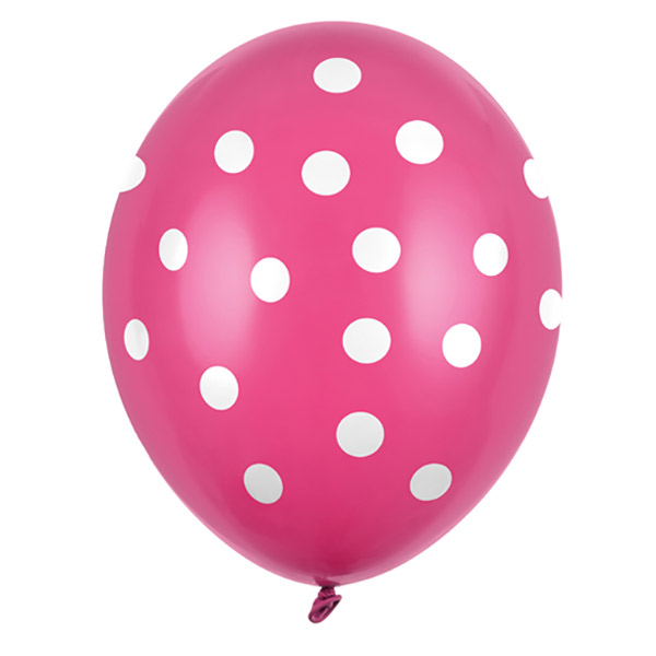V paketu je 6 balonov pastelno roza barve z belimi pikami.