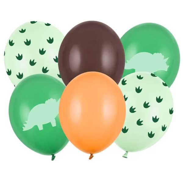 Set vsebuje 6 balonov (2 v pastelno smaragdno zeleni barvi s potiskom, 2 v pastelno pistacijski barvi s potiskom, 1 v pastelno svetlo oranžni barvi, 1 v pastelno kakavovo rjavi barvi).
