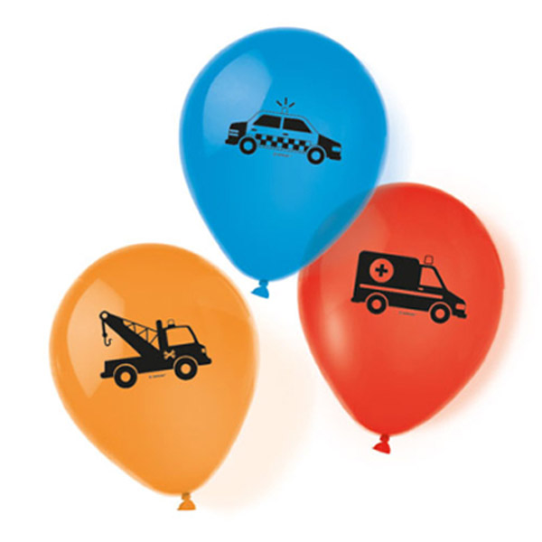 6 lateks balonov oranžne, modre in rdeče barve z motivi vozil.