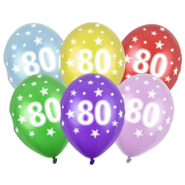 V pakiranju so barvni baloni za rojstni dan (6 kosov). Lateks baloni številka 80 so primerni za praznovanje 80. rojstnega dne ali obletnice.