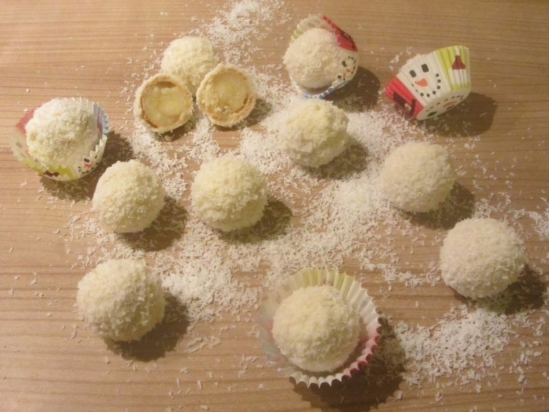 Priprava: sladkor in mleko zmešamo z vodo in kuhamo na nizki temperaturi. Dodamo margarino, 100 g kokosove moke, dobro premešamo in ohladimo. S tankim nožem odstranimo polovice kroglic, jih napolnimo z nadevom in sestavimo 54 kroglic z lešniki.