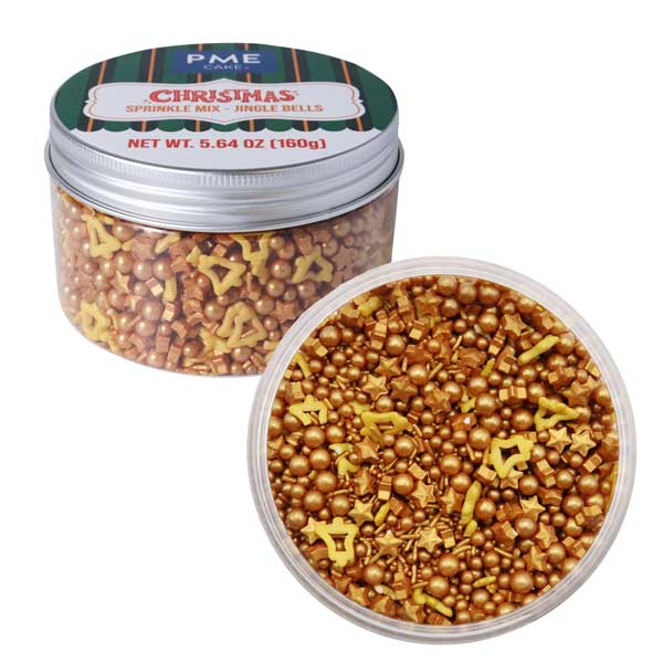 160 g posipa v veseli mešanici zvezdic, biserov, zvončkov in palčk z zlato temo.