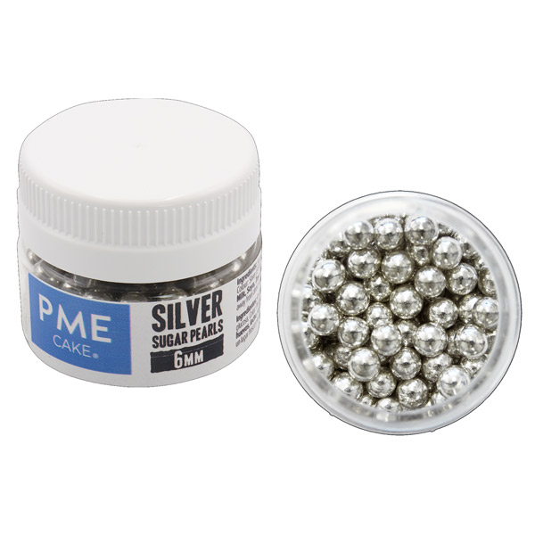 Sladkorne kroglice velikosti 6 mm v srebrni barvi.