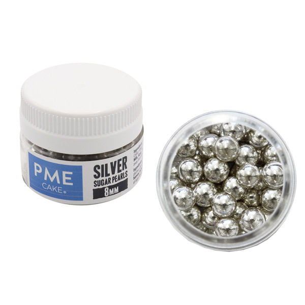 Sladkorne kroglice velikosti 8 mm v srebrni barvi.