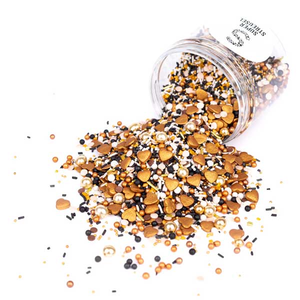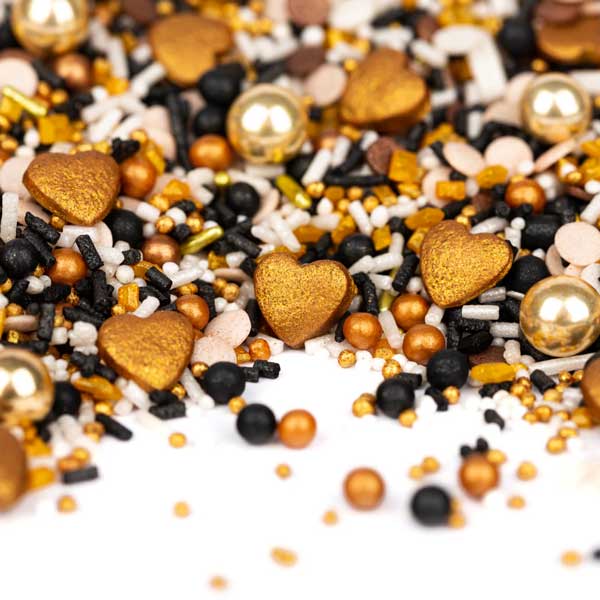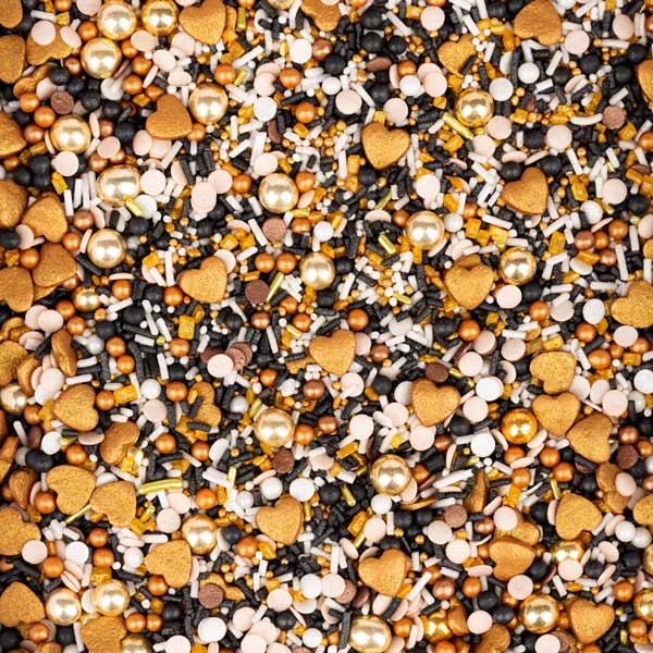 Posip Casanova je mešanica zlatih čokoladnih kroglic in srčkov, konfetov v nežnem krem tonu in rjavi barvi, posip in kroglice v črni in bronasti barvi.