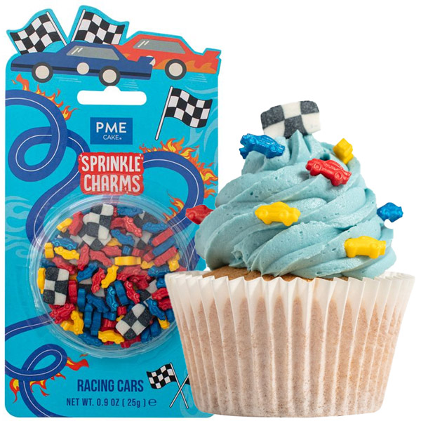 PME mešanica za posip v obliki rdeče-modrih dirkalnikov in črno-belih zastav je preprost in praktičen dodatek za dekoracijo vaših sladic.