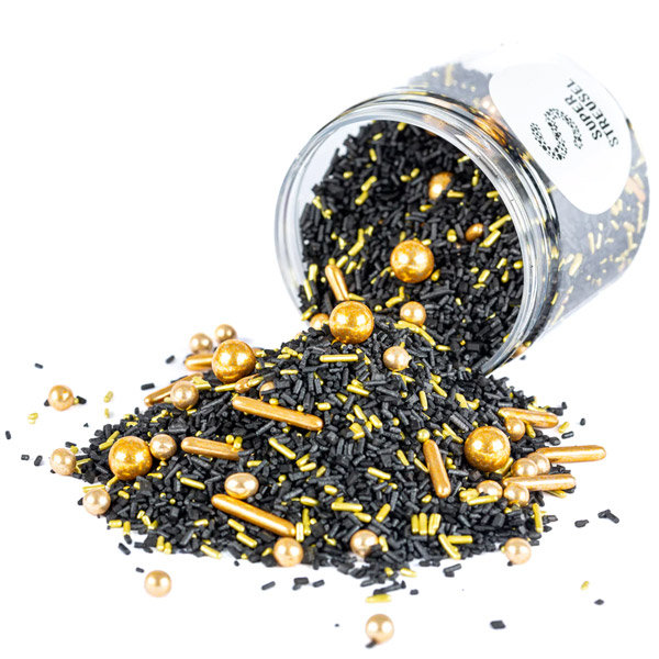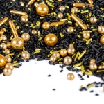 Okrasite svoje torte, cupcakes, krofe in druge dobrote z zlatimi in črnimi odtenki tega posipa.