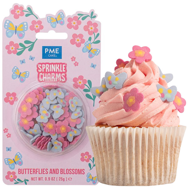 PME mešanica za posipanje v obliki modrih metuljev in roza marjetic je preprost in praktičen dodatek za dekoracijo vaših sladic.