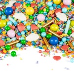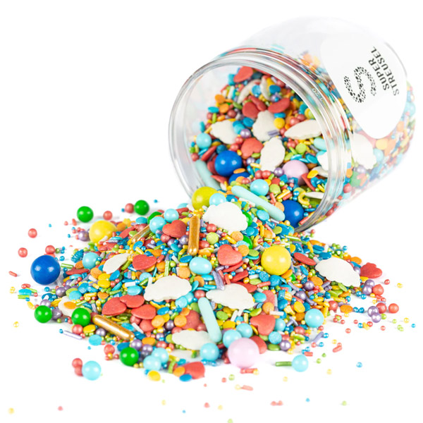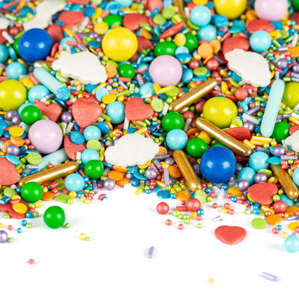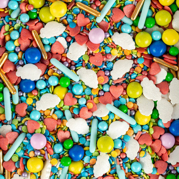 Sladkorni posip v mavričnih barvah! In ker ni mavrice brez oblakov in sončnih žarkov, tudi se najde merica posipov za oblake in zlate sladkorne palčke kot sončne žarke.
