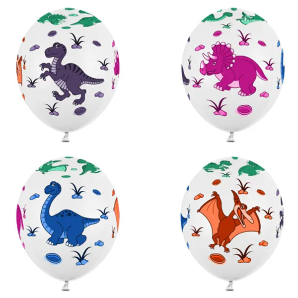 6 lateks balonov v pastelno beli barvi s potiskom dinozavrov.