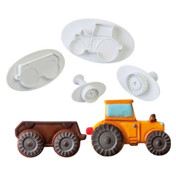 Set vsebuje 4 izsekovalca: Traktor (58 x 85 mm), prikolica (36 x 73 mm), kolo Ø 32 in kolo Ø 24 mm.