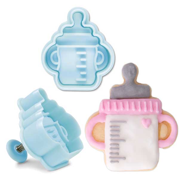 Orodje za izrez oblike iz sladkorne mase z ekstraktorjem v obliki stekleničke z dudo.