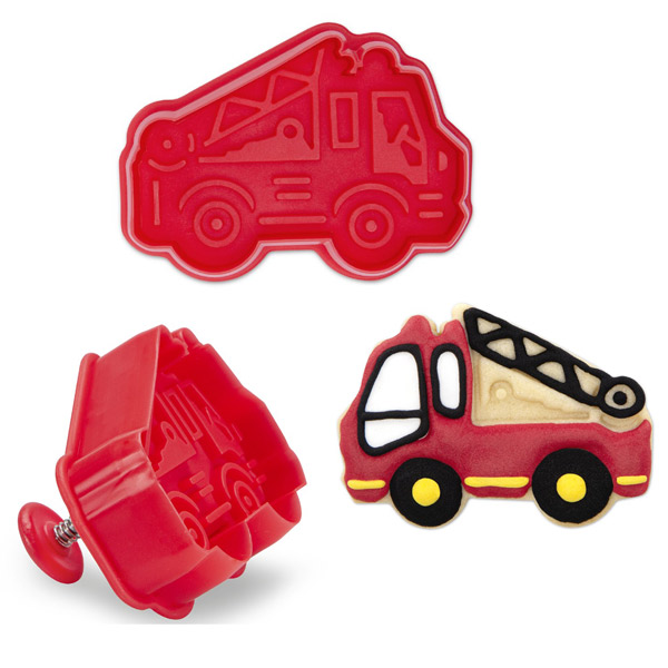 Orodje za izrez oblike iz sladkorne mase z ekstraktorjem v obliki gasilskega avta.