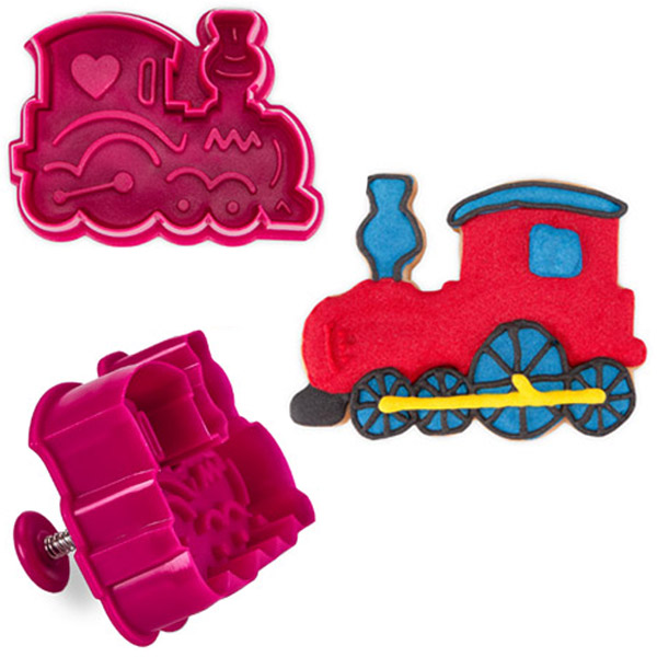 Orodje za izrez oblike iz sladkorne mase z ekstraktorjem v obliki lokomotive.