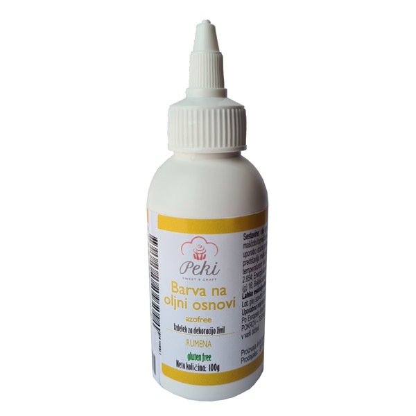 Uporaba: v maščobi topne barve na oljni osnovi, idealne za barvanje čokolade in maščobnih mas, kot so maslene kreme, peciva in slaščic. Pred uporabo dobro pretresite. Barvilo dodajte izdelku, ki ga želite barvati.