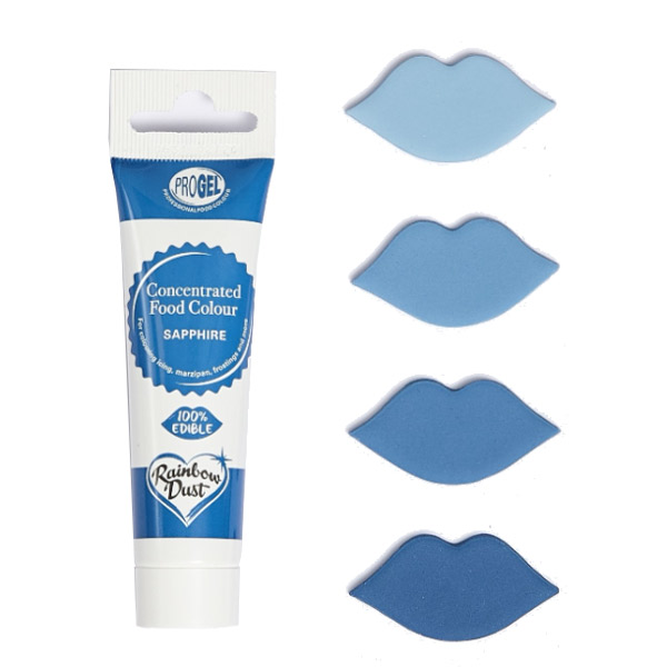 Le majhna količina ProGel-a je potrebna za pridobitev globokih in bogatih barv vaših izdelkov, kar pomeni da bo vaša tubica barve trajala polno časa. Enostavno dodajte majhno količino vašemu fondantu, marcipanu, masleni kremi, smetani, biskvitnemu testu, …