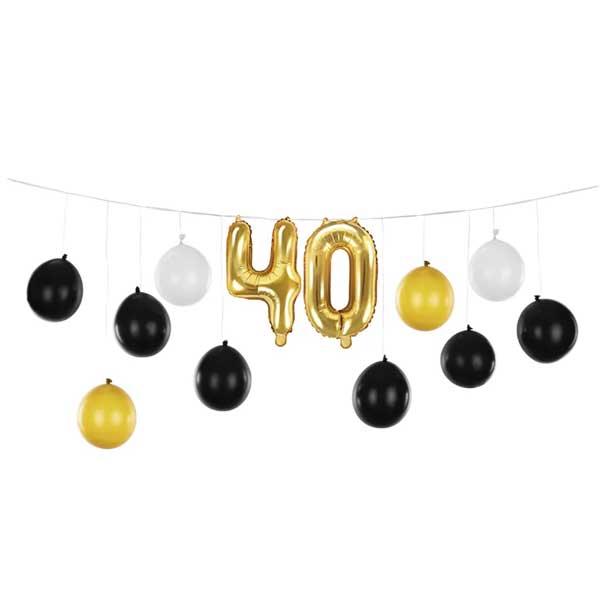 Girlanda iz balonov 3 v 1 - 40. rojstni dan v črni, zlati in beli barvi.