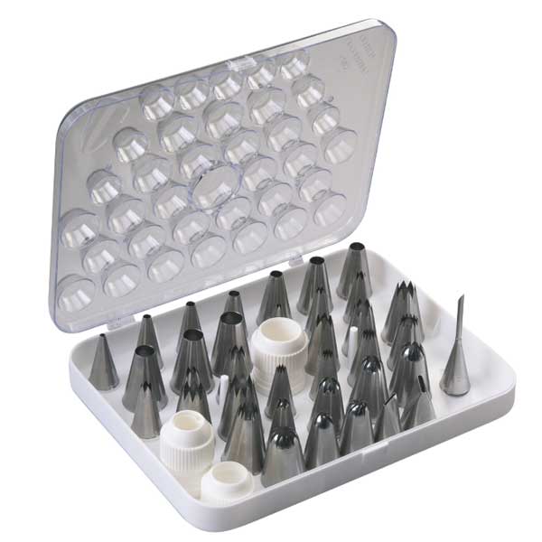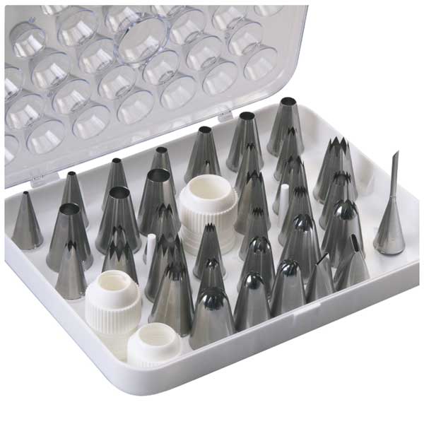 Komplet, sestavljen iz 36 različnih nastavkov iz nerjavečega jekla za dekoriranje in 3 adapterja.