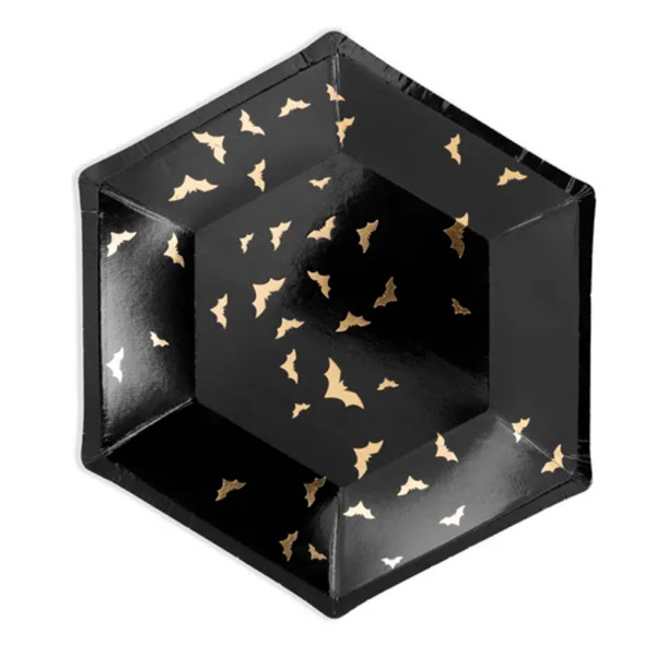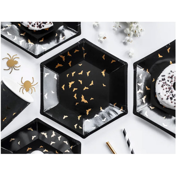 Papirnati krožniki Trick or Treat v črni barvi z zlatim vzorcem.