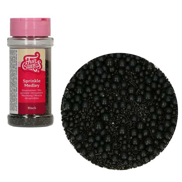 Sladkorni posip v obliki črnih perlic različnih velikosti.
