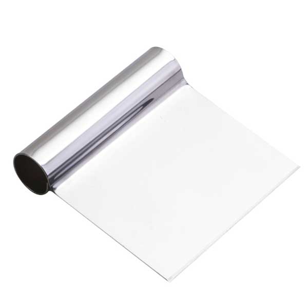 Strgalo za rezanje testa z okroglim ročajem ter ravnim in pravokotnim rezilom, v celoti izdelano iz nerjavečega jekla.
