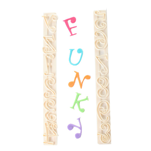 Komplet velikih tiskanih črk in števil ''Funky'' za izrez iz sladkorne mase. Črke so velikosti 3 - 3,5 cm.