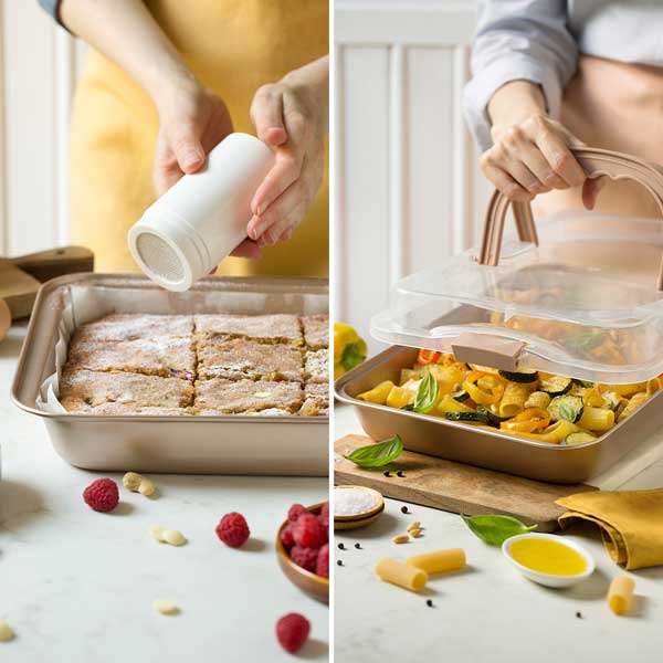 2-delni set, sestavljen iz visokokakovostnega kovinskega kalupa s premazom proti prijemanju in 1 praktičnega pokrova za shranjevanje in prenašanje vaše