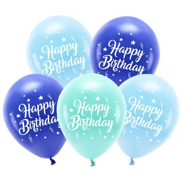 Pastelni baloni v mornarsko modri, nebesno modri in temno mint barvi z belim dvostranskim tiskom Happy Birthday.