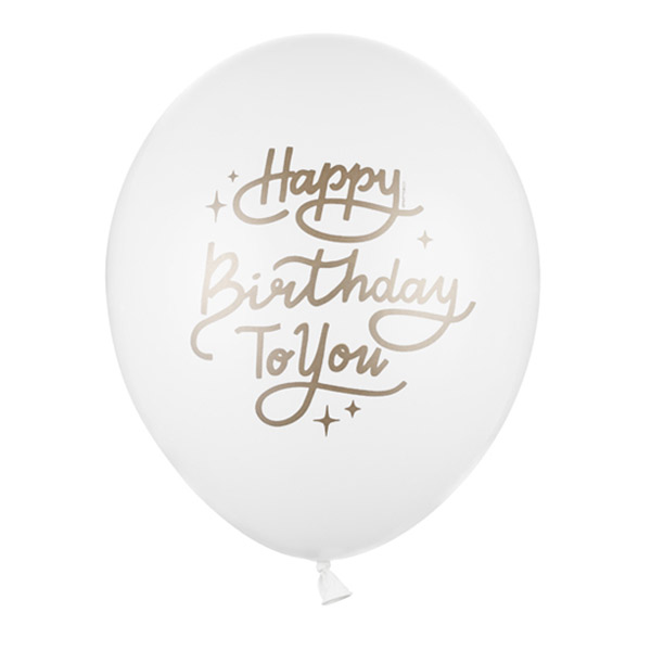 50 lateks balonov v pastelno beli barvi z zlatim potiskom '' Happy birthday to you ''.