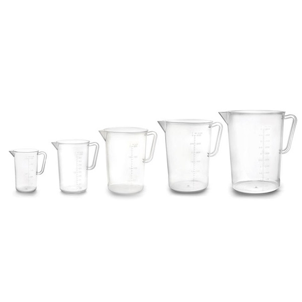 Posoda je plastična z vgraviranimi merami in priročnim ročajem.