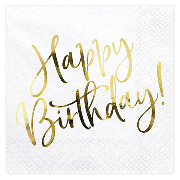 Dvoslojne papirnate serviete z napisom Happy Birthday v zlati barvi.