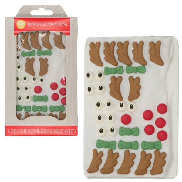 Vsebuje 12 dekoracij: oči, rdeče noske, rogovje in pentlje za izdelavo severnega jelena.