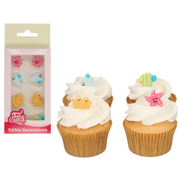 V kompletu je 8 jedilnih sladkornih dekoracij v obliki ribe, kita, raka in morske zvezde.