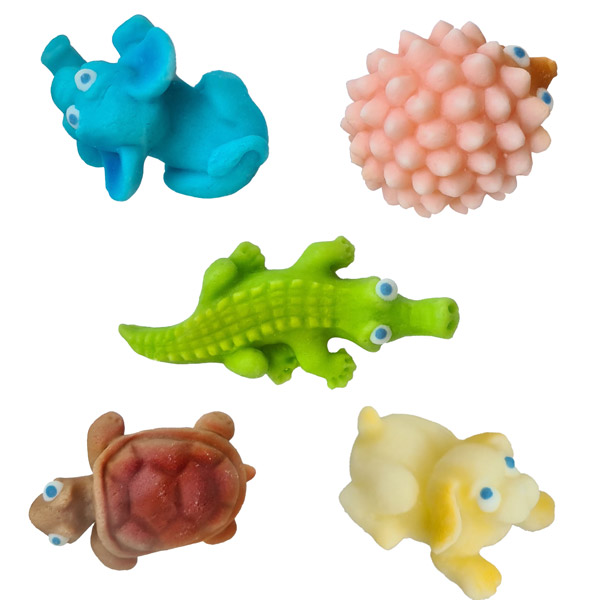 V pakiranju je 5 živalic mešano (želva 3x4 cm, muca 3x2 cm, pes 3x2 cm, slon 3x4 cm, krokodil 6x2 cm, ježek, ....).
