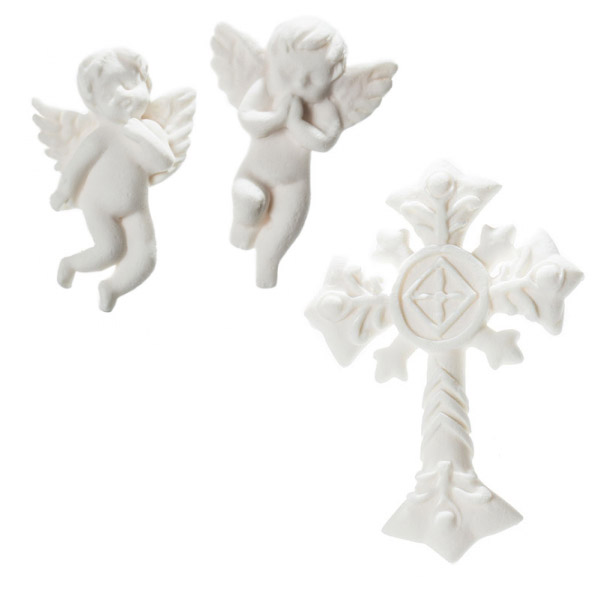 V paketu prejmete 3 figurice: 1 križ velikosti cca 70x50 mm in 2 angelčka velikosti cca 50x35 mm.