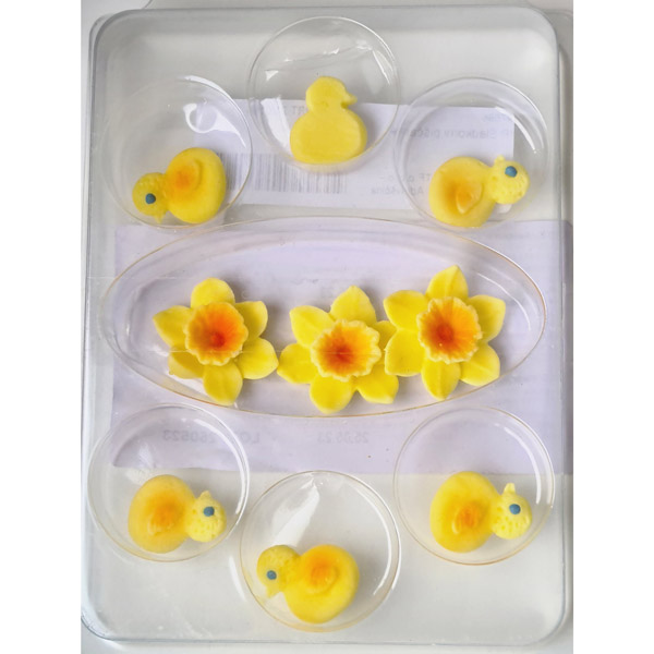 V pakiranju je 6 piščančkov velikosti 20 x 15 mm in 3 rožice.