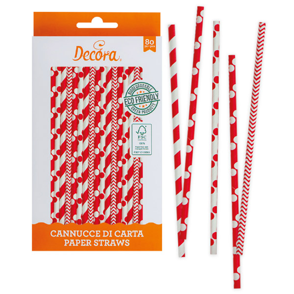 Biorazgradljive papirnate slamice v mix rdeče beli barvi.