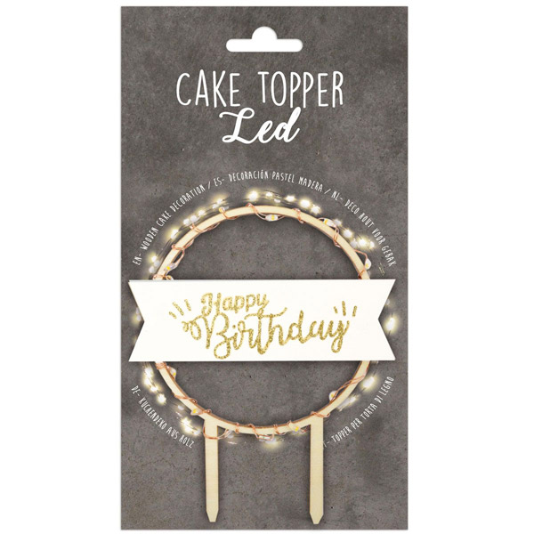 Leseni tortni topper z LED lučkami, napis Happy Birthday.